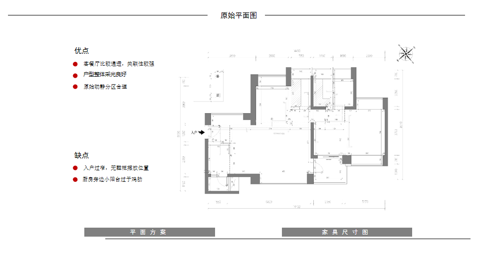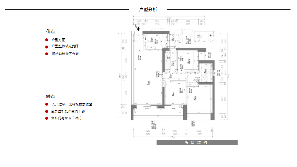 客餐廳比較通透,關聯性較強、戶型整體采光良好、原始動靜分區合理戶型缺點: