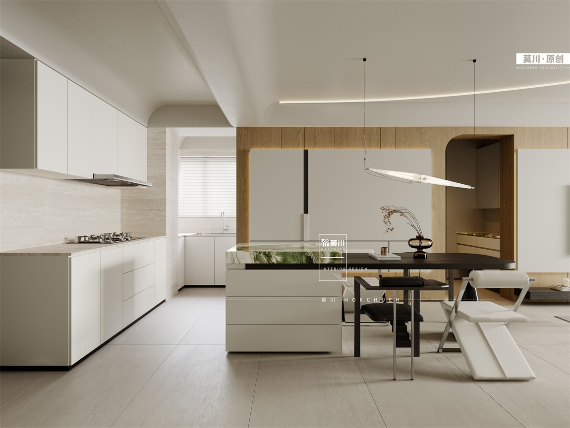 整體層高較低,凈高2.6米,業(yè)主想要無主燈效果,考慮層高因素,以線條燈為切入點,在整個天花以弧形劃分,增加空間靈動感,補充整體空間照明,以4公分的超薄造型,打造天花無主燈效果,餐廚一體化設計,提高入戶空間感,增加餐廚尺度感,增加餐邊柜功能細分,整體以簡約設計為主調(diào),以簡單的線條,比例分割豐富空間層次