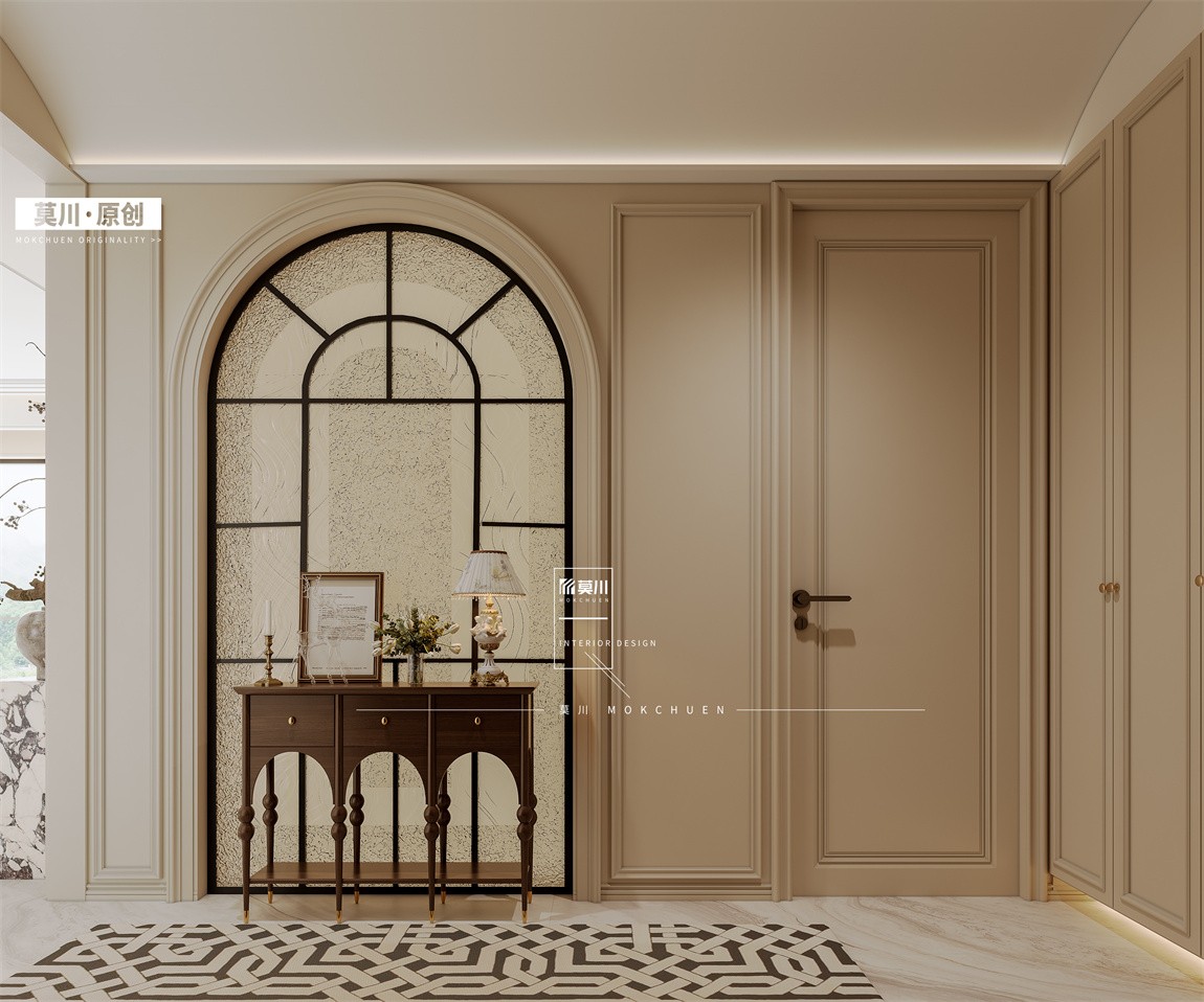 入戶(hù)玄關(guān)的藝術(shù)玻璃造景+臺(tái)燈營(yíng)造回家的歸屬感