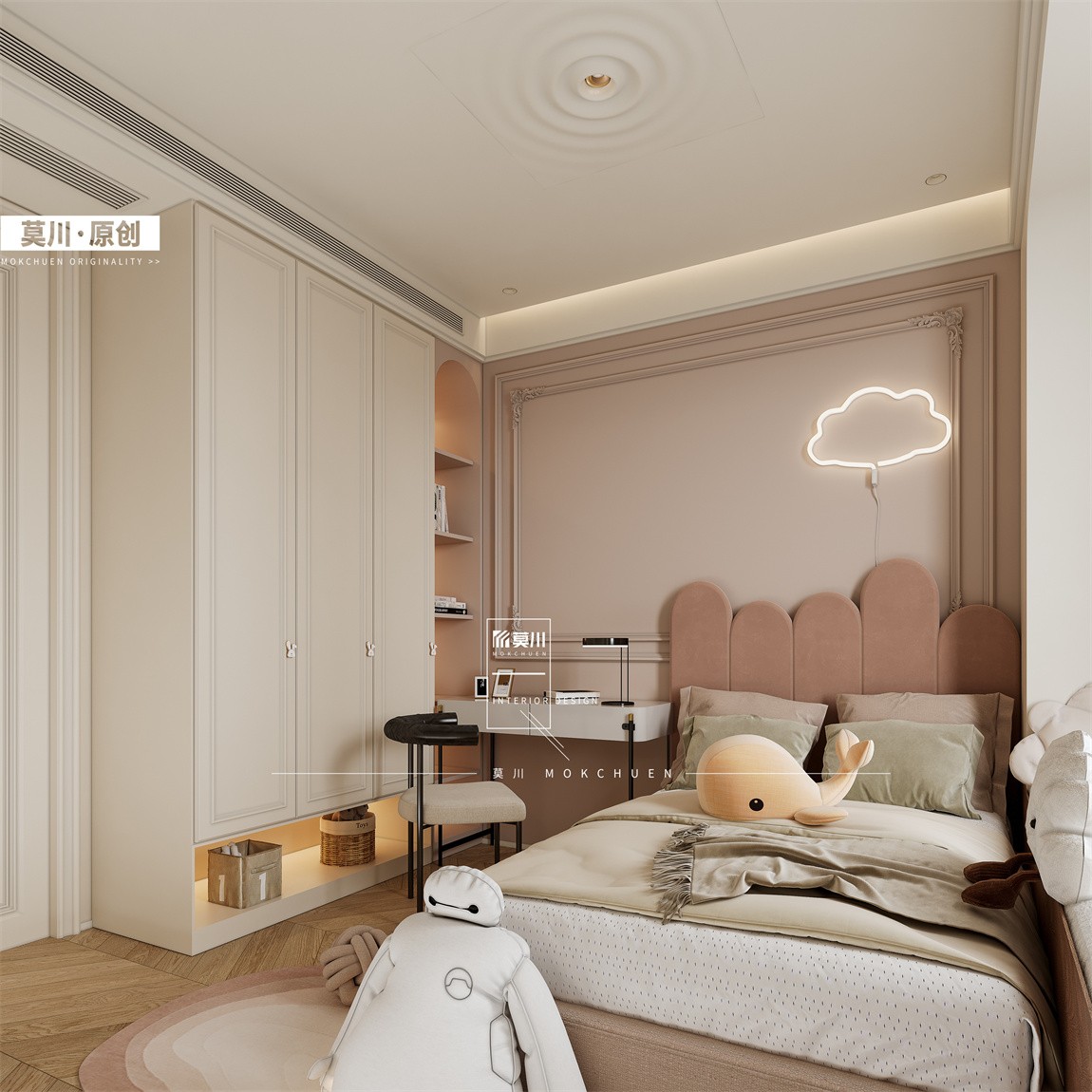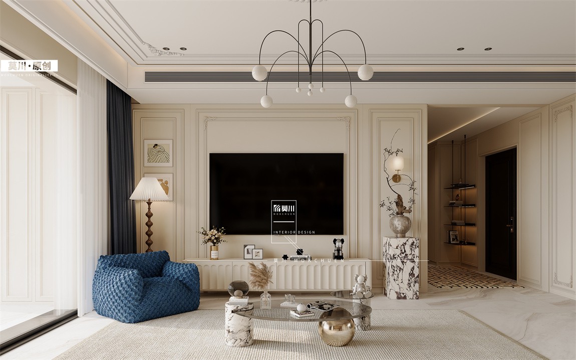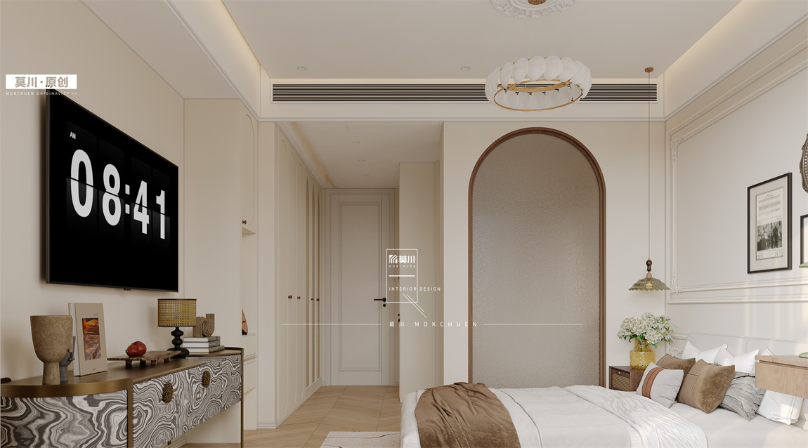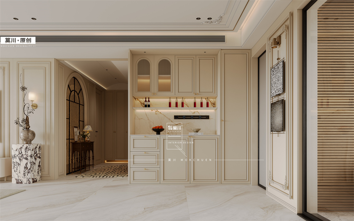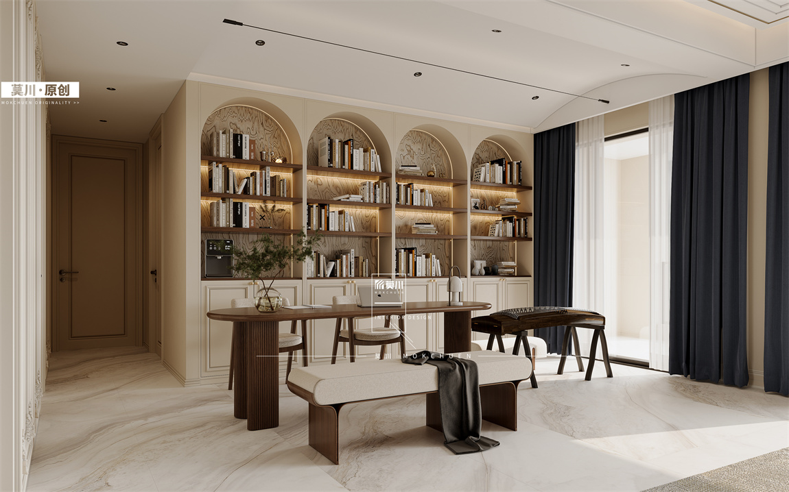 客廳書(shū)柜用法式原色結(jié)合山水紋理的背景板,更具特色
