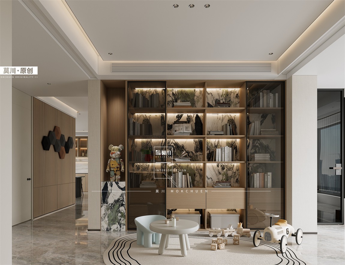 設計亮點:客廳立柱的設計細節,將原有的立柱做了解構重新賦予材質后在視覺上做了弱化,各個空間的收納和儲物解析比較細致,所有的物品都有該去的柜子或者箱子,公區書柜增加空間效果的同時培養了小朋友閱讀習慣和收納整理習慣