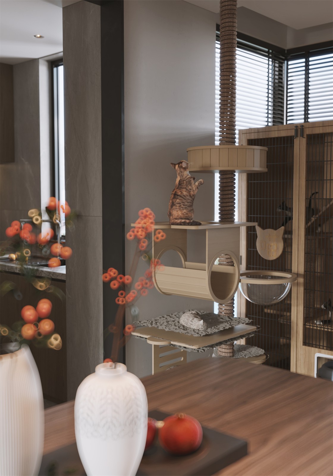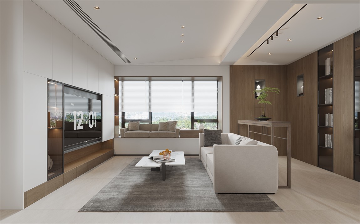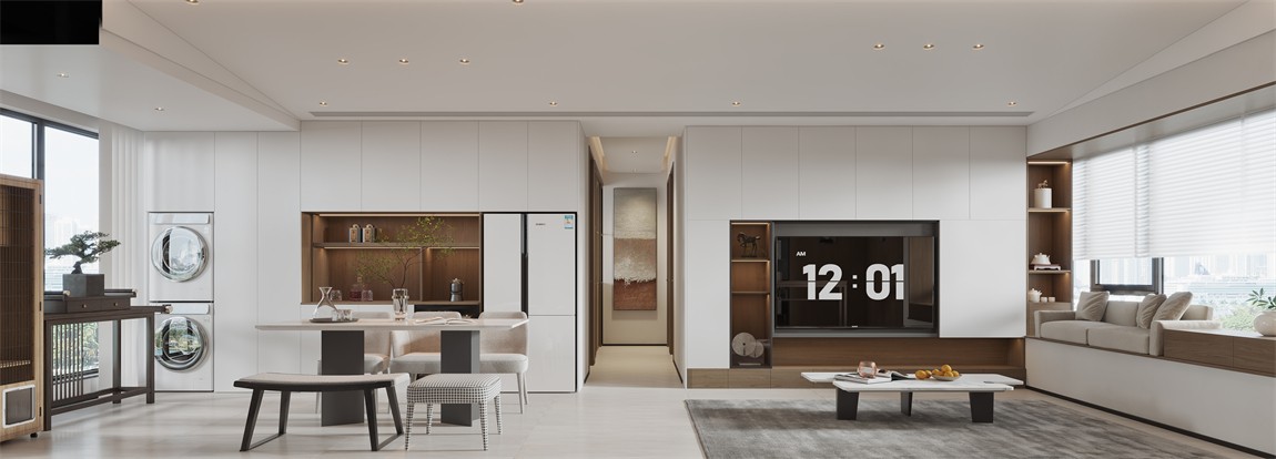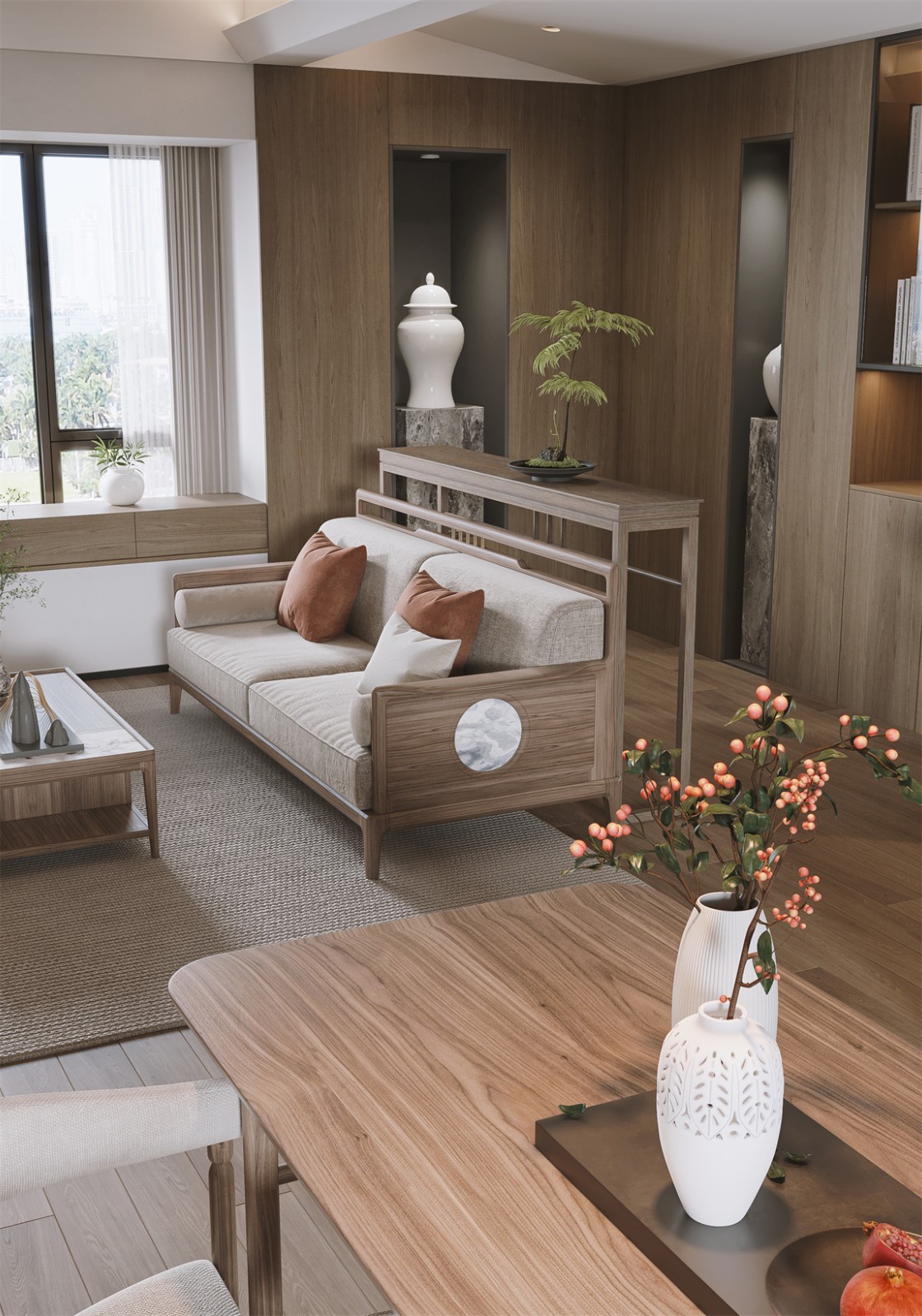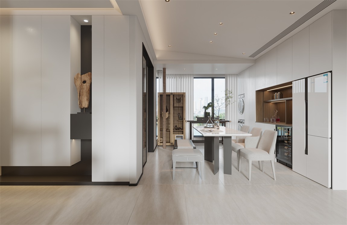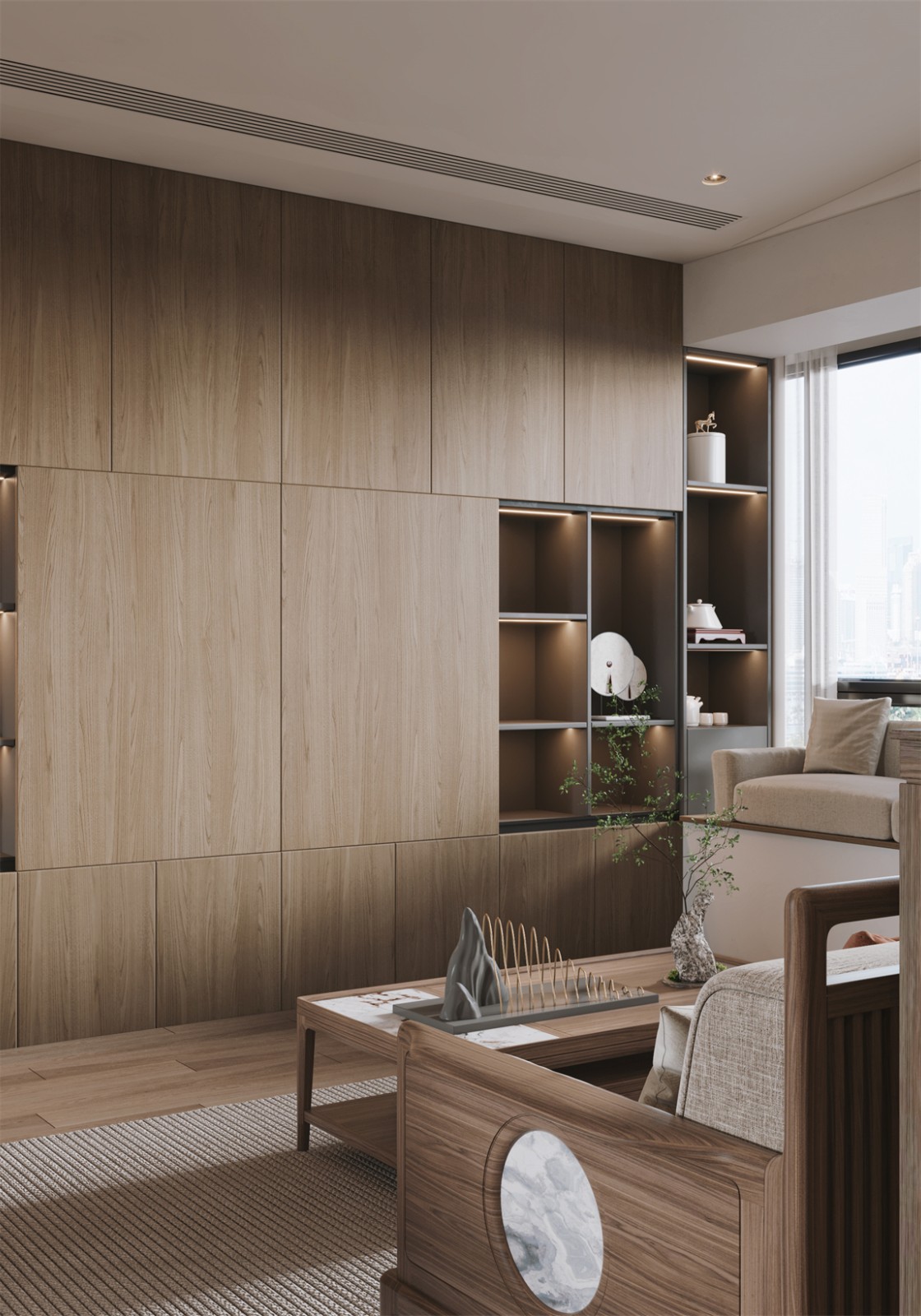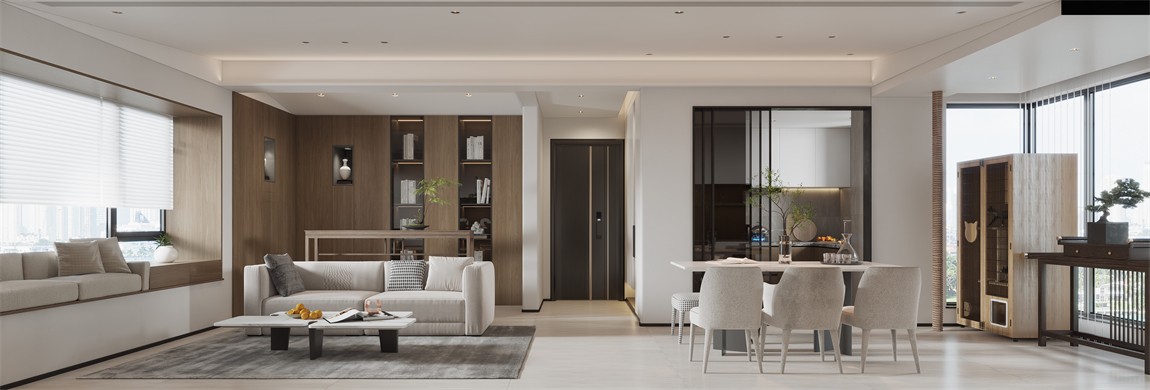 公共區域和小房間整體去做,擴大公共區域的視野感,也有獨立的展示區和書房,另外提取中式元素的斜屋頂,配合軟裝氛圍去營造公共區域氛圍